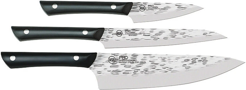 Hammered finish AUS-6M stainless blade. Black POM handle. Full tang. Includes: 13″ overall Chef’s with 8″ blade; 8″ overall paring with 3.75″ blade; 10.5″ overall utility with 6″ blade. Clam packed.