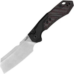Automatic opening. 4.375” closed. 3.375” Stonewash finish CPM-154 stainless steel cleaver blade. Black anodized aluminum handle with red carbon fiber onlay on the presentation side. Button Lock. Lanyard Hole. Tip-Up reversible pocket clip. Boxed.