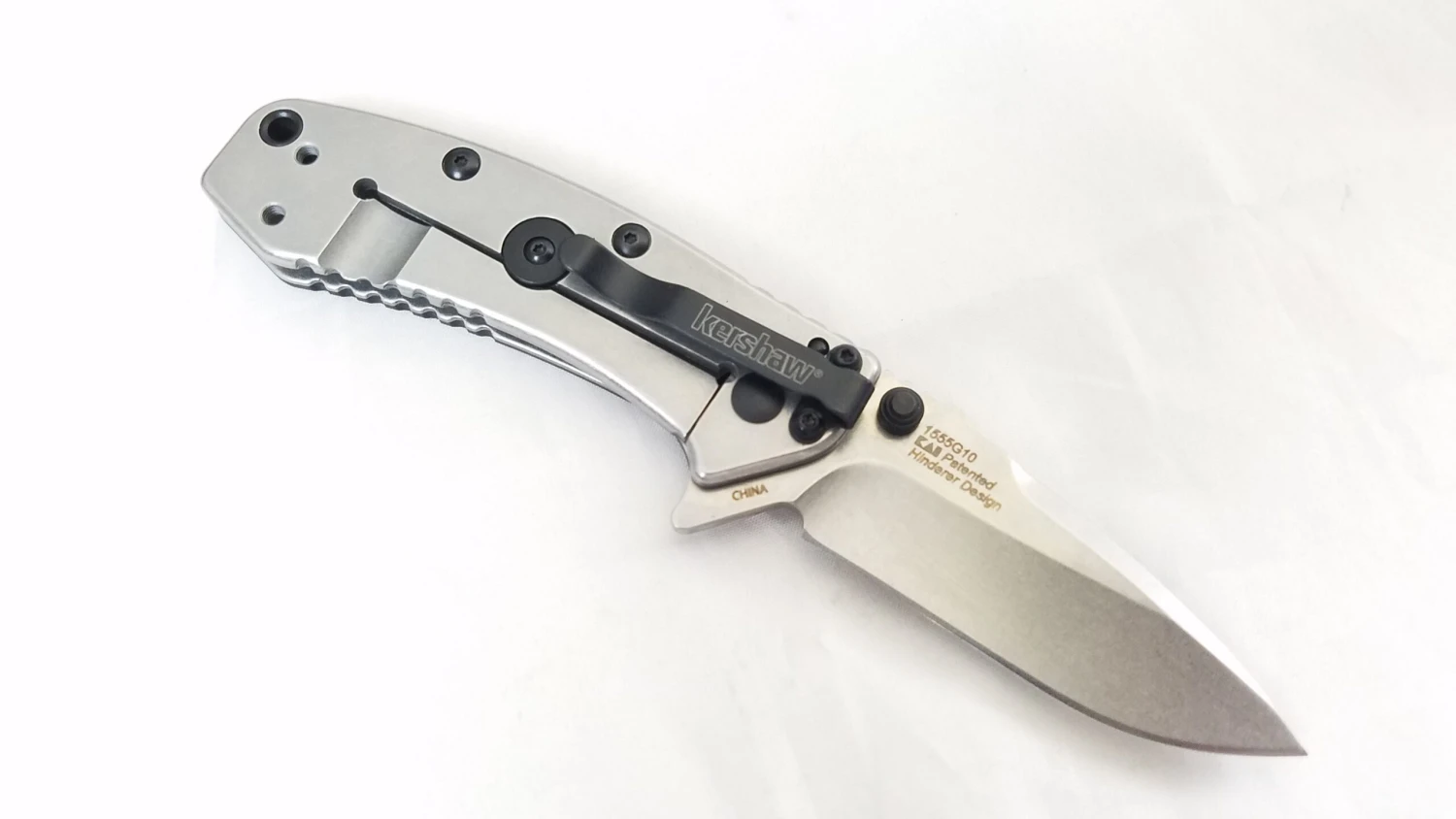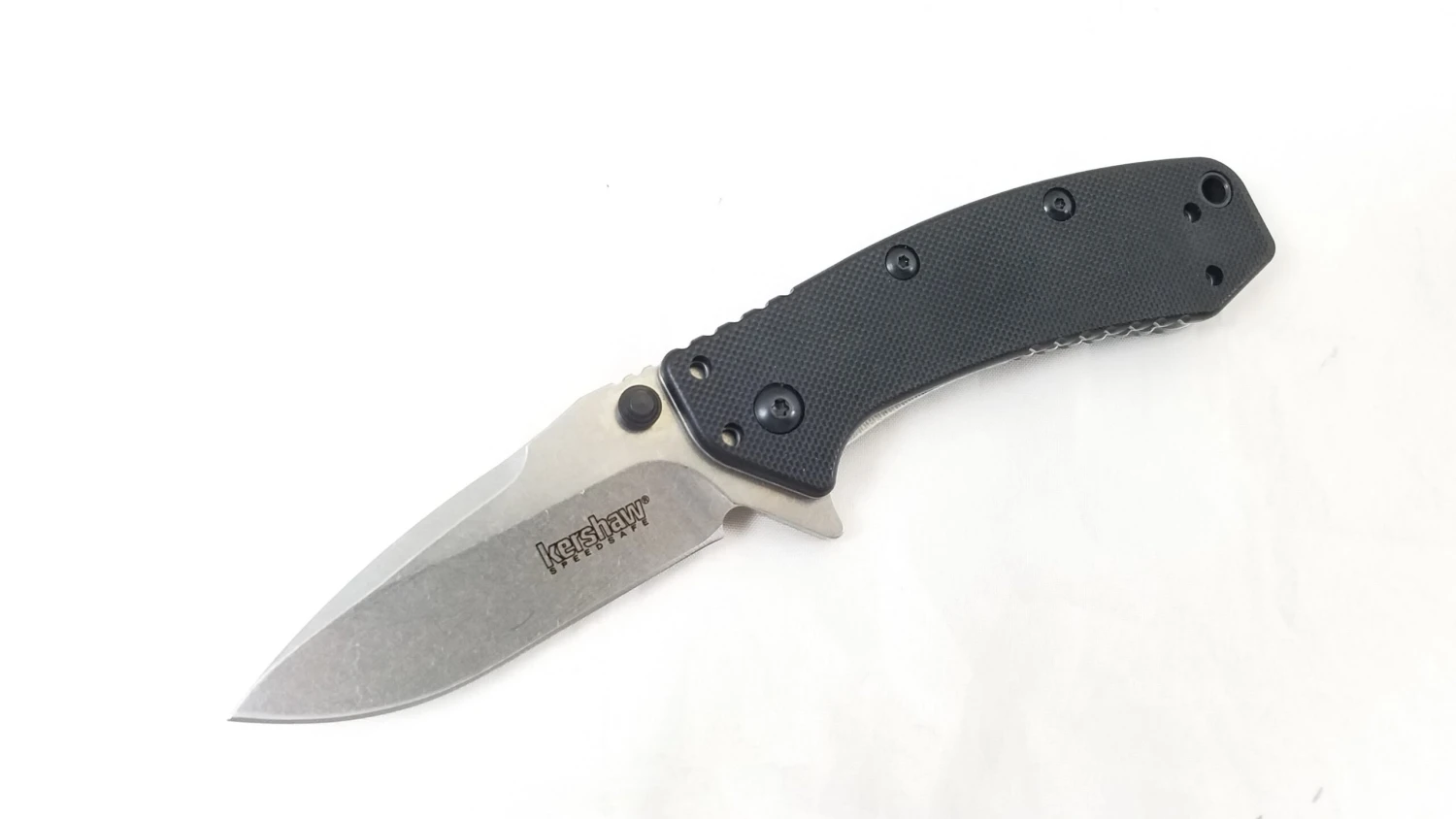 Kershaw Cryo G-10 A/O – 3 3/4″ closed. 2 3/4″ 8Cr13MoV stainless blade with stonewashed finish, dual thumb studs, and flipper. Features SpeedSafe assisted opening. Textured black G-10 front handle, and 410 stainless back handle with stonewashed finish. Lanyard hole. Stainless pocket clip. Designed by Rick Hinderer. Boxed.