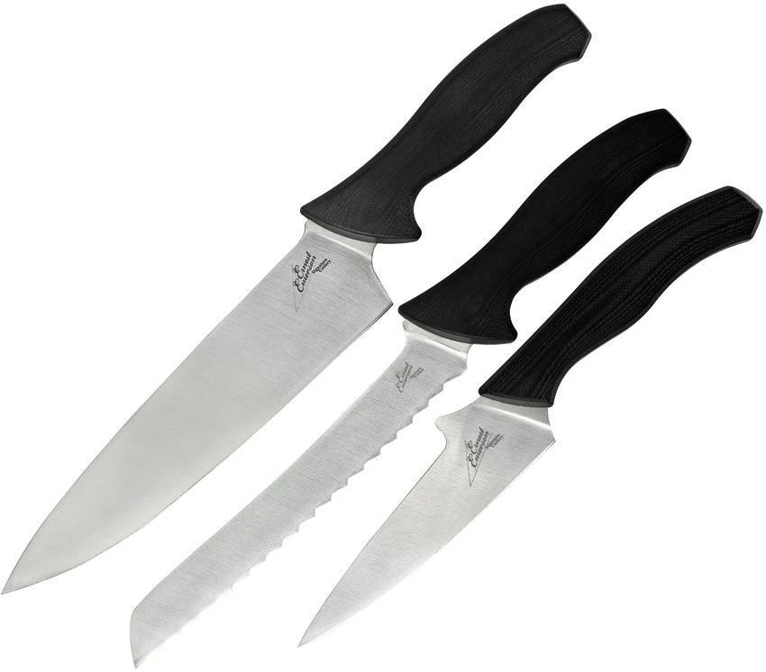 Satin finish 4116 stainless blade. Black FRN handle. Full tang. Includes: 12.5″ overall bread with 7.25″ blade, 13.25″ overall Chef’s with 7.75″ blade, and 8″ overall paring with 4.25″ blade.
