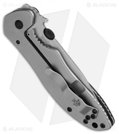 Designed by Ernie Emerson, built by Kershaw. The CQC-7K is a compact manual opening knife with a tanto blade that’s outfitted with a thumb disk and Emerson’s quick wave opening feature. It has a steel frame lock handle with a G-10 front scale.