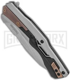 The Kershaw Endgame is definitely a knife that qualifies to be your weapon of choice. This blade is made from D2 steel with a stonewash finish. The Steel handle has a bead blast finish with bronze PVD and black GFN overlays to accent the form of this piece. The flipper tab whips the blade open on KVT ball bearing pivots that are easy to maintain silky action.