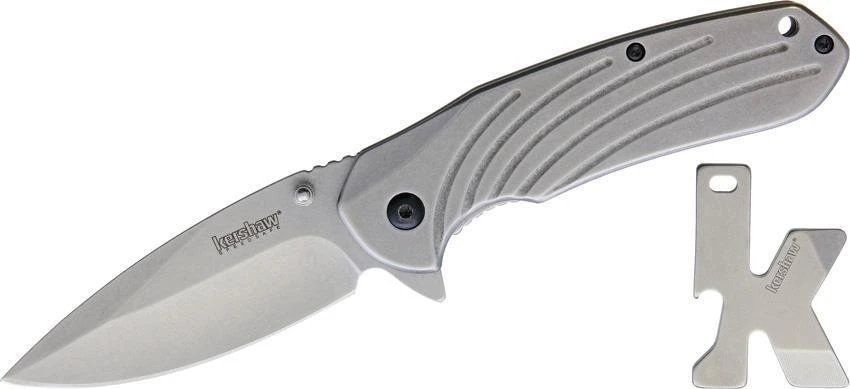 Assisted opening framelock. 4.52″ closed. 3.30″ 3Cr13MoV drop point blade. Dual thumb studs. Stonewashsed stainless handle with lanyard hole. Black pocket clip. Includes stonewashed stainless “K” tool multi tool.Â